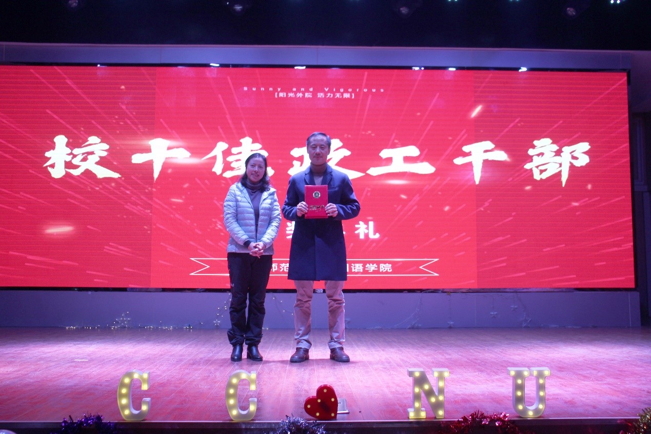 学生成绩的取得,离不开老师们的辛勤付出,精彩的节目过后,进入2018-2019学年学院“十佳班主任”、校“十佳政工干部”的颁奖环节。2016级俄语班班主任刘永红,2017级法语班班主任杨芬,英语1806班班主任何卫华,英语1801班班主任李正林,英语1602班班主任向宗平,英语1705班班主任尹蔚,英语1502、1503班班主任谢瑾,英语1701班班主任付丽,日语1701班班主任李莹以及2017级韩语班班主任齐颖获得院“十佳班主任”称号,英语系老师张茂林获得“校十佳政工干部”称号。台下欢呼声阵阵,同学们用热烈的掌声表达对老师们的感谢与祝福。外院老师们不仅教学出色,更是多才多艺。颁奖环节过后,由李云书记伴奏、辅导员罗璇老师演唱的歌曲《贝加尔湖畔》及李云书记的口琴独奏《斯卡布罗集市》展现了老师们独特的一面,温柔的歌声配上优美的琴音,引得现场连连叫好。