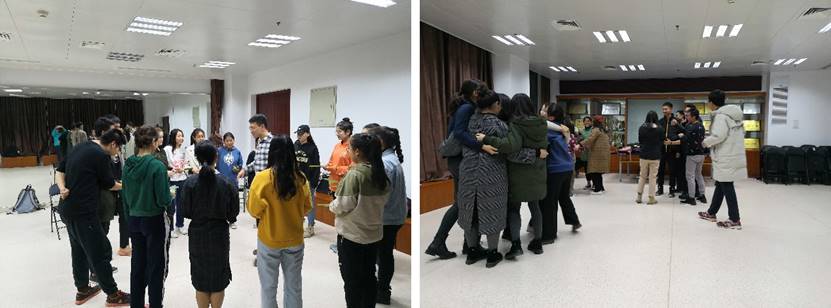 第二环节是破冰游戏“喊数抱团”,参与团辅的同学们围绕成一个圆圈伴随着音乐的声音开始慢跑,由刘鹏老师根据所有人数决定喊出数字,同学们按照数字的大小,与附近的同学迅速地抱成一团,最后没有抱团成功的同学们被淘汰出局。通过“喊数抱团”的小游戏,调动了同学们的积极性和主动性,增加大家的参与程度,培养同学们的群体意识与共同归属感。