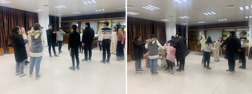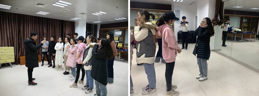 下面是第四环节“快乐传真”,参与团辅的同学们分为两组按列背对主讲人刘鹏老师,由刘鹏老师分别向每列第一位同学传达信息,后由第一位用肢体表达给第二位,由此类推,最后一位同学根据前一位同学的动作猜测成语内容,若猜测准确则获胜。此游戏通过信息传递的不确定和不完整性考验团队默契度和想象力。在日常生活中,正是由于沟通的不畅通往往会导致矛盾的产生和激化,因此,同学们在交流过程中需要搭建有效沟通的桥梁,做到信息的传递通畅。