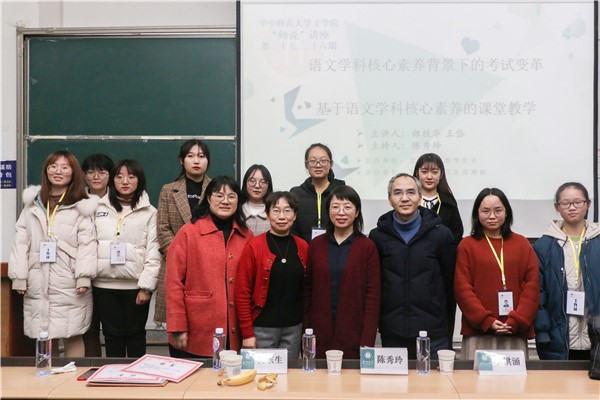 12月20日下午,由华中师范大学文学院主办,文学院团委、学生会师范生训测部承办的第二十五、第二十六期“师说”讲座于九号楼9-11教室举行。出席本次讲座的嘉宾有文学院院长王洪涌,陈秀玲副教授,武汉市高级教师吴东生教研员。本期讲座由郑桂华老师、王岱老师担任主讲人,她们分别以“语文核心素养背景下的测评变革”和“基于语文学科核心素养的课堂教学”为主题,就如何面对新高考改革、如何打造一节高效的语文课堂向同学和老师们进行了讲解。
