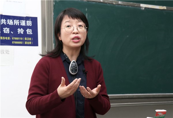 十分钟中场休息后,王岱老师展开讲解。她首先阐明学科素养内涵,并提炼出语言的建构与运用、思维发展与提升、审美鉴赏与创造、文化传承与理解四大语文核心素养主题词。期间,王岱老师多次运用设问,对当今教学现状举例作答,并强调语言建构、思维发展与提升和语文活动的重要性。她认为文本的学习阅读主要着眼点应落在语文课堂和文本上。对此,王岱老师说:“虽说人情练达即学问,但文本重要,写作也很重要。”接着,王岱老师提出学习任务群这一教学模式。她认为教学任务必须包括学科知识,且应与学生的接受程度相匹配,当代老师应具有任务意识、增强整体意识、提高统筹能力、实现教师的教学角色的转变,尊重并强调学生的主体地位。