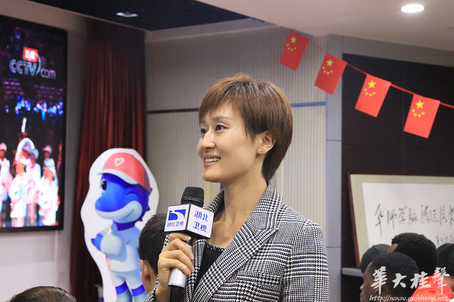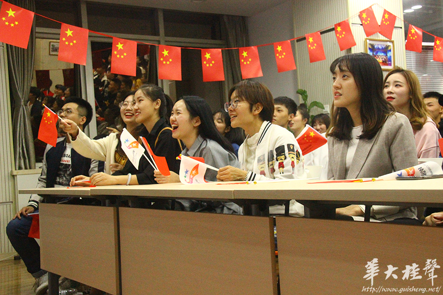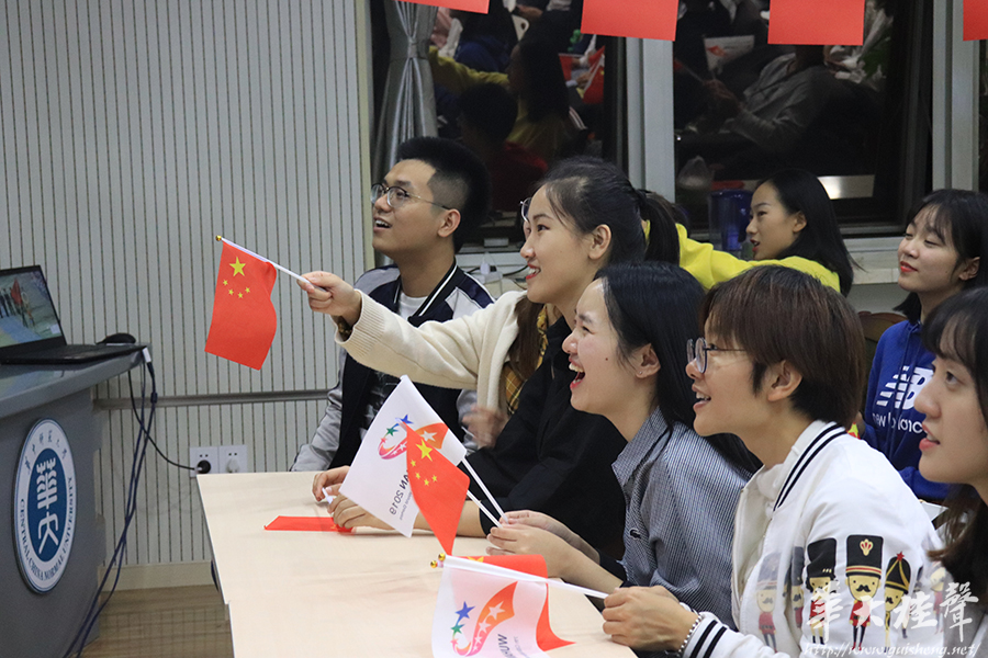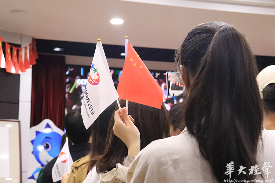 报告厅四周红旗飘扬,吉祥物“兵兵”也守护在演播屏两侧,两个小时的观看活动,让同学们感受到了强烈的参与感和自豪感,也感受到身处武汉能够参与其中,每个人都跟军运会有着千丝万缕的联系。同样,他们也对代表华师参加军运会开幕式的身边朋友们表示祝贺与敬佩。