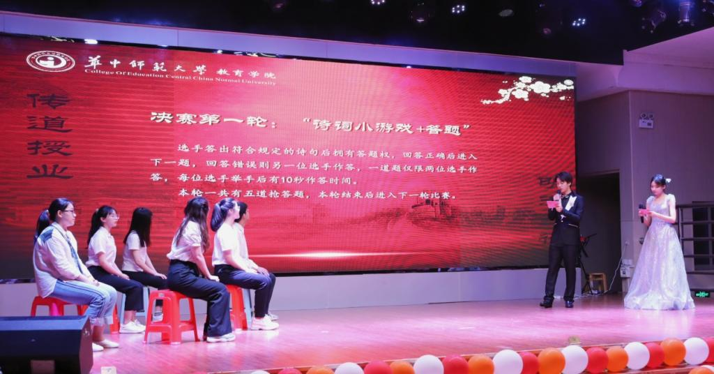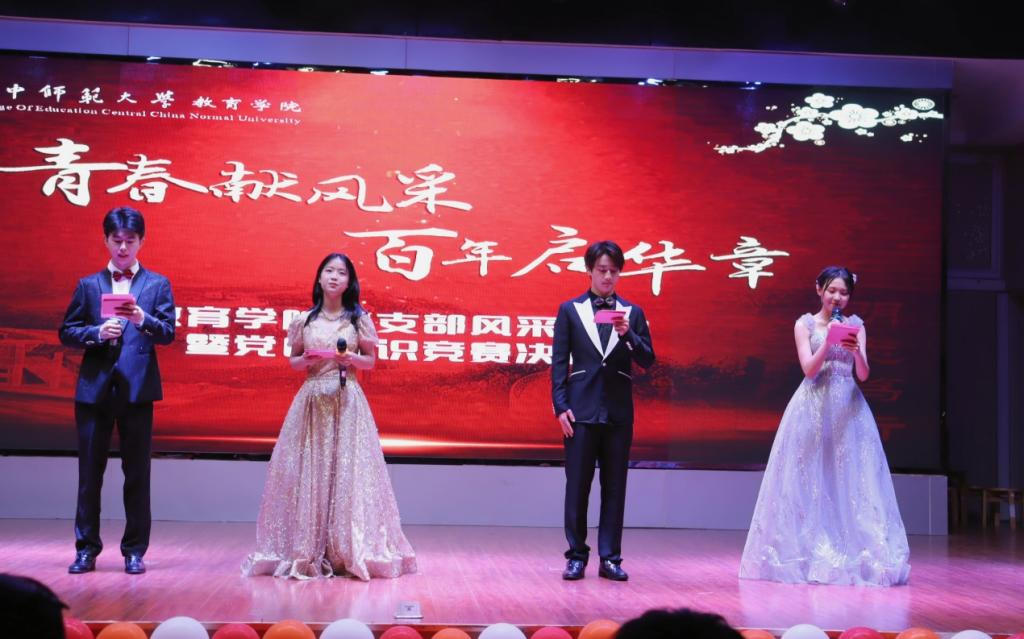 教育学院融媒体中心讯(通讯员 胡家嘉等)5月29日,华中师范大学教育学院团支部风采展演暨党团知识竞赛决赛在校大学生活动中心五楼举行,教育学院党委副书记黄玉新,教育学院团委书记刘雅欣,化学学院团委书记马莹,校团委办公室主任陈凌继霄,人工智能学部团委书记宋陈虹依等出席,教育学院班主任代表张莉、张娜、宫慧娜、邹红军、孙银光等参加。各团支部进行以“青春献风采、百年启华章”为主题,带来朗诵、歌舞、舞台剧、手语歌等多种形式的节目汇演。