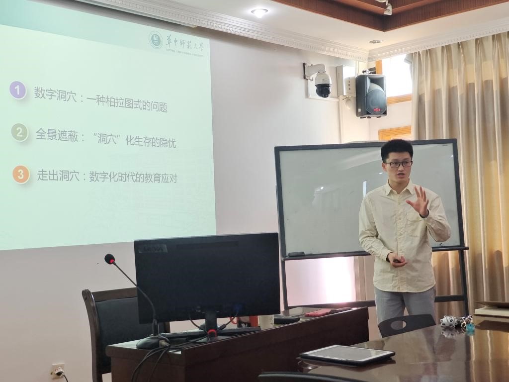 教育学院融媒体中心讯(通讯员 赵洪瑶 朱燕婷)2022年10月13日12:30-13:40,教育学院第41期学术午餐会于田家炳教育书院624会议室举行。本期学术午餐会报告主题为《走出“数字洞穴”:数字化时代的生存隐忧与教育应对》,教育学系青年教师邹红军副教授主讲,学前教育系主任吴航副教授主持。科研副院长雷江华教授、周小李教授、张莉副教授、伍远岳副教授、李卉副教授、张添翼副教授,孙银光、邢欢、白颖颖、杨大伟、刘庆龙、孙冉等老师与部分本科生、硕博研究生,共40余人,参加了本次学术午餐会。