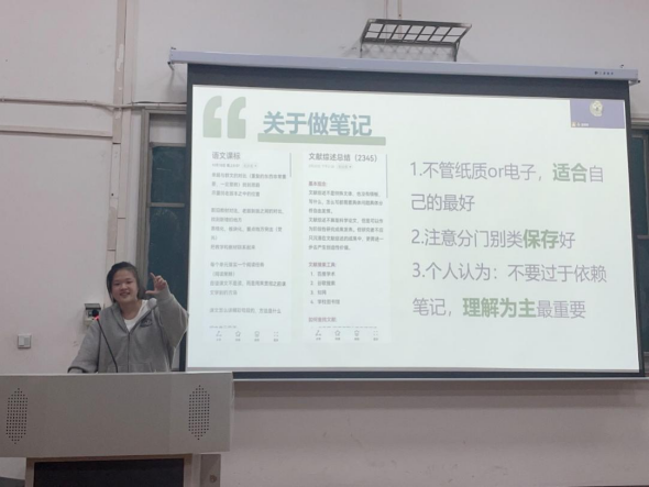 主讲人许畅充分结合个人发展情况进行了分享。她根据个人的学业反思指出合理分配时间精力的重要性,提醒同学们平衡好专业学习和学生工作,并围绕如何提升学习成绩这一问题提出了针对性的建议。此外,她还分享了自己在各类比赛、科研项目与志愿服务活动方面的经验。