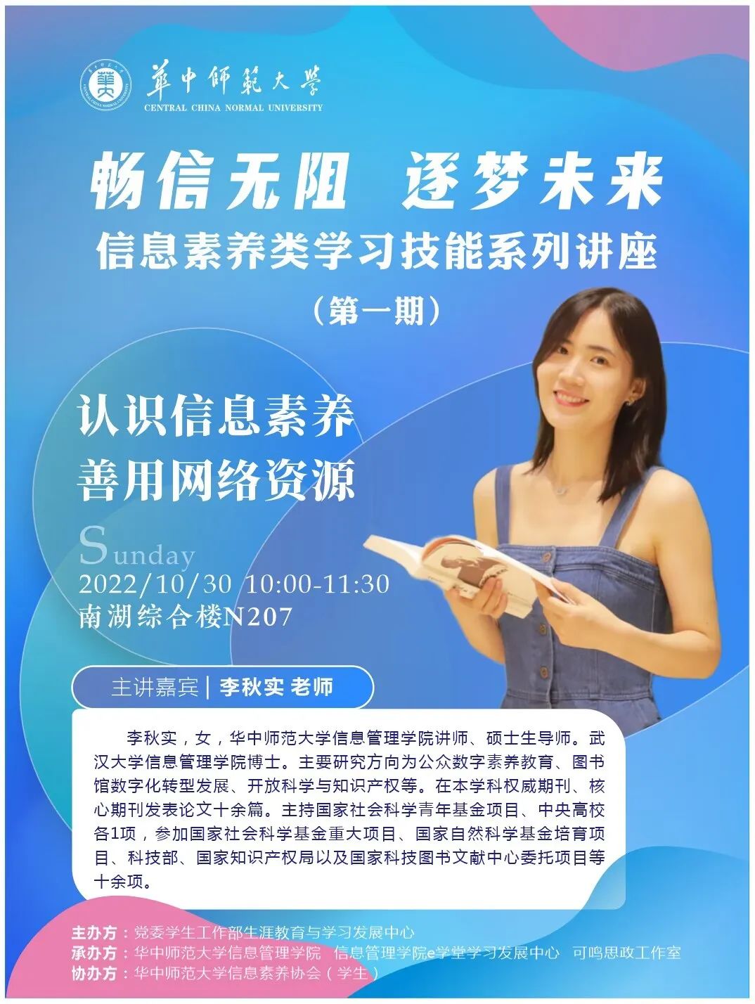 10月30日上午,由校党委学生工作部生涯教育与学习发展中心主办,信息管理学院承办的信息素养训练营第一期讲座于南湖综合楼N207教室举行,华中师范大学信息管理学院讲师、硕士生导师,武汉大学信息管理学院博士——李秋实应邀作了题为“认识信息素养,善用网络资源”的讲座。
