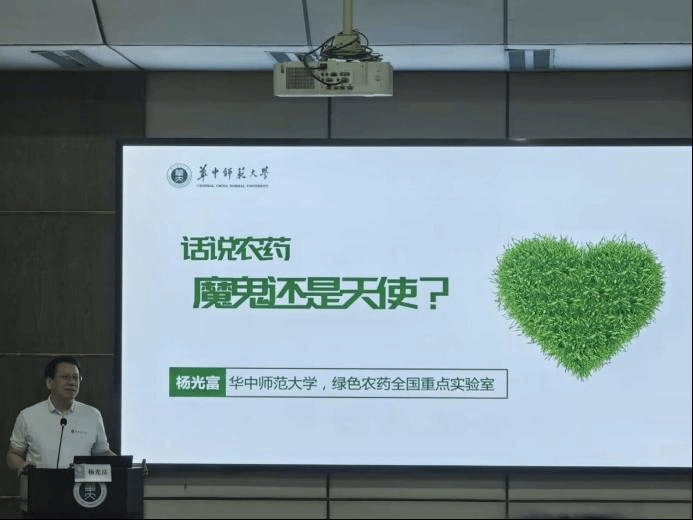 杨光富教授还介绍了华中师范大学农药学科的发展历程。他指出,通过几代人的努力,华中师范大学已经成为我国开展农药科技创新和高层次人才培养的重要基地,研制出水胺硫磷、甲基异柳磷、喹草酮等多个农药新品种,为我国的农药工业和农业丰产做出了重要贡献。他勉励同学们要树立科学精神,加强专业知识学习,练好基本功,努力成为新时代的高素质人才。讲座最后,同学们积极提问,杨光富均一一耐心解答,并向同学们赠送了《话说农药:魔鬼还是天使?》科普图书。