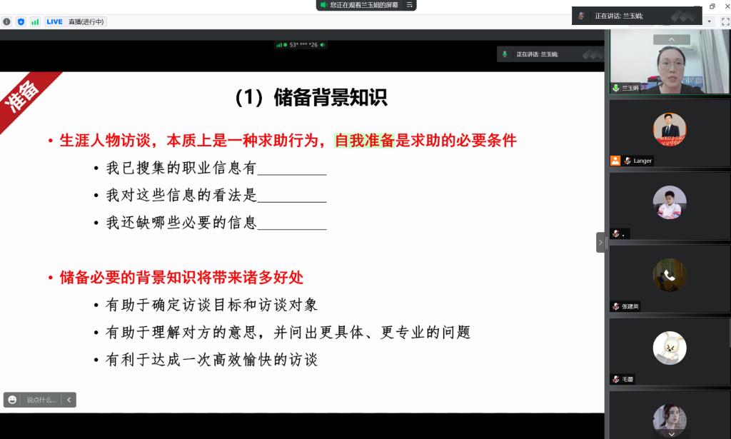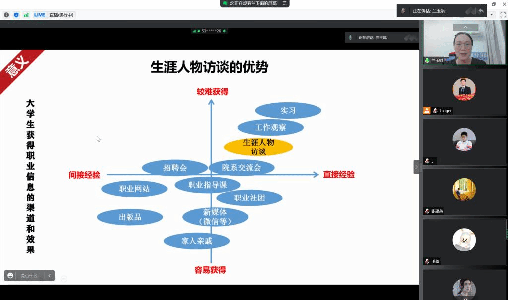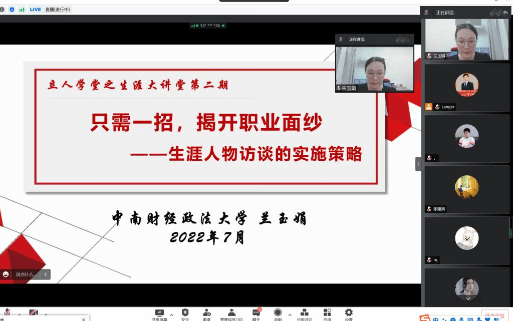 为帮助同学们了解生涯人物访谈的相关事宜,揭开职业的神秘面纱,7月15日晚7点,立人学堂第二期生涯大讲堂在腾讯会议如期召开,本期讲座的主题为《只需一招,揭开职业面纱——生涯人物访谈的实施策略》。本次讲座邀请到中南财经政法大学就业指导教研室副主任、GCDF全球职业规划师兰玉娟副教授担任主讲嘉宾。讲座由生涯教育与就业创业指导专家郎东鹏教授主持,来自不同学院的百名同学积极参与。