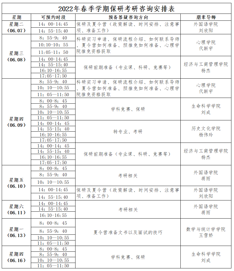 为解决同学们在准备考研、保研中遇到的问题,更好实现长远的发展,校级学习发展中心邀请了7位成功考研或保研的优秀毕业生,为有考研或保研需求的同学提供“一对二”咨询活动,帮助同学们扫清“备研”道路上的障碍、明确目标方向。