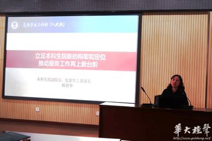 韩君华详细介绍了本科生院的成立背景和当前结构,并借副校长夏立新在10月25日专题党课中提到的“落实立德树人根本任务,构建五育并举育人体系”的理念将“一体化贯通式培养,提高本科人才培养质量”的工作目标进行深化。