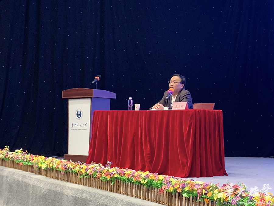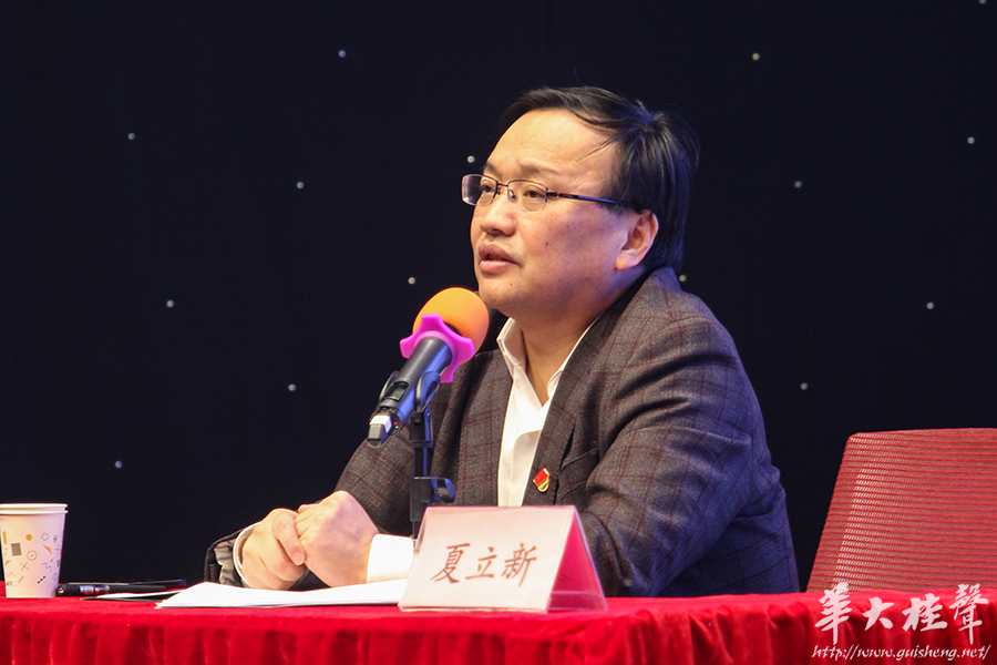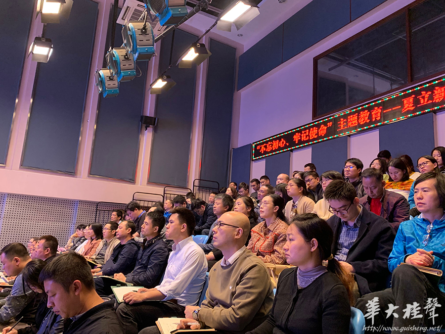 华大桂声讯 10月25日下午,夏立新副校长“不忘初心、牢记使命”主题教育专题党课在九号楼六楼演播厅展开。夏校长联系的本科生院党支部、研究生院党支部、教育信息技术学院分党委全体教工党员及部分学生党支部书记参加此次专题党课,党课由党委学生工作部部长韩君华主持。