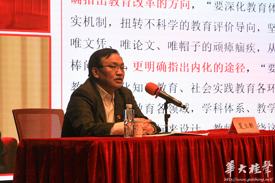 夏立新以“落实立德树人根本任务,构建‘五育并举’培养体系”为主题,重温习近平总书记关于教育的重要论述,并结合学校的实际情况跟在场的党员进行了交流讨论,着重对“立德树人”和“五育并举”进行讲解。